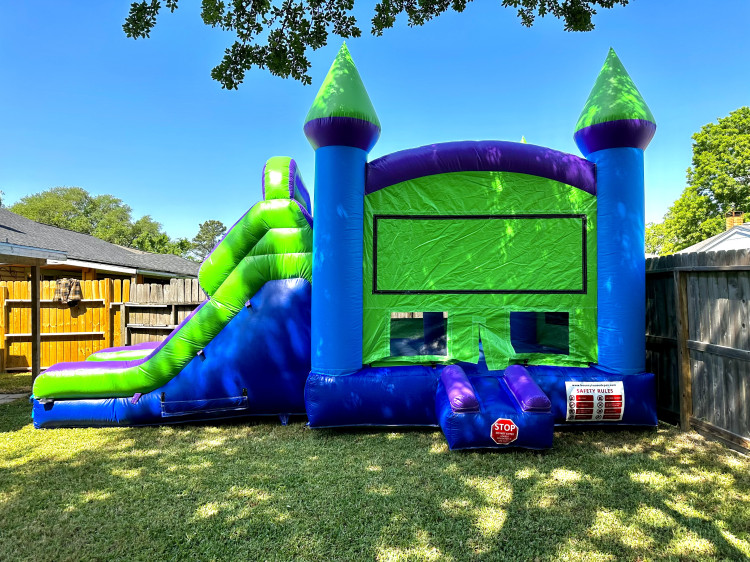Bouncy Combo 43 is a bright, eye-catching inflatable combo unit that brings together a classic bounce area and an attached slide for double the fun in one rental. Its colorful design features bold blue, green, and purple accents, along with castle-style towers that give it a playful look kids will love. The large front opening makes it easy to enter, and the roomy interior provides space for active play before heading up the side climb and down the slide. This setup is a great choice for birthdays, school events, family gatherings, and other celebrations where you want an inflatable that keeps guests moving and entertained.
